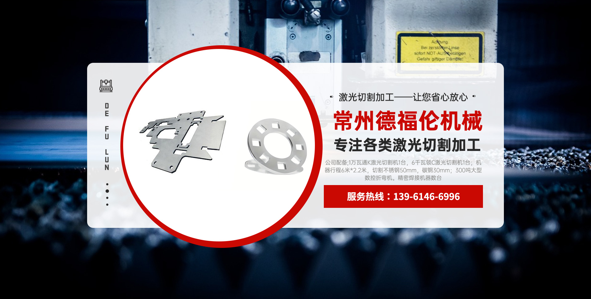 常州德福倫機械有限公司成立于2014年12月19號,位于江蘇省常州市武進區(qū)遙觀鎮(zhèn)建農(nóng)村劍童路56號西門;公司配備;1萬瓦通K激光切割機1臺,6千瓦領(lǐng)C激光切割機1臺;機器行程6米*2.2米,切割不銹鋼50mm,碳鋼30mm;300噸大型數(shù)控折彎機。精密焊接機器數(shù)臺。本公司可以承激光切割加工件、,精密折彎件、精密鈑金、專營配套的各類鐵板,不銹鋼板。長期積累的加工經(jīng)驗,加上形成的質(zhì)量管理體系和計劃管理程序,使我們公司的加工能力大大提高,滿足客戶所需,是我們公司的目標(biāo)!公司奉行“以誠待人,服務(wù)為上,價格滿意”的宗旨。歡迎各位領(lǐng)導(dǎo);老總前來洽談合作!